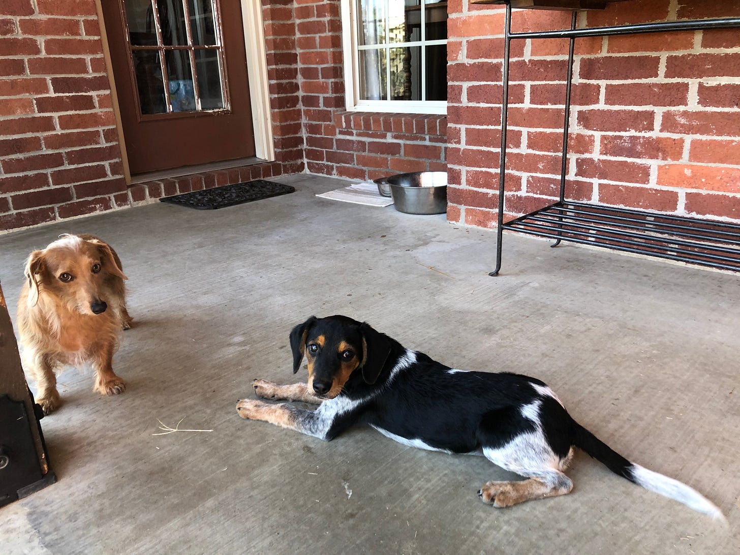 This is my new puppy Jasper, a blue heeler/beagle mix and my mother-in-law’s dog Ellie, a dachshund. Ellie was rescued from a puppy mill and Jasper was rescued from a crossroads on the highway. Ellie is not sure how she feels about Jasper just yet, as you can likely see by the suspicion in her eye.